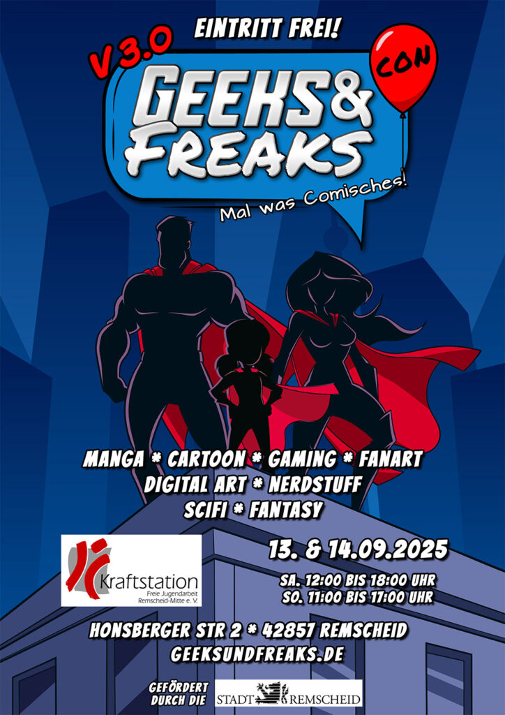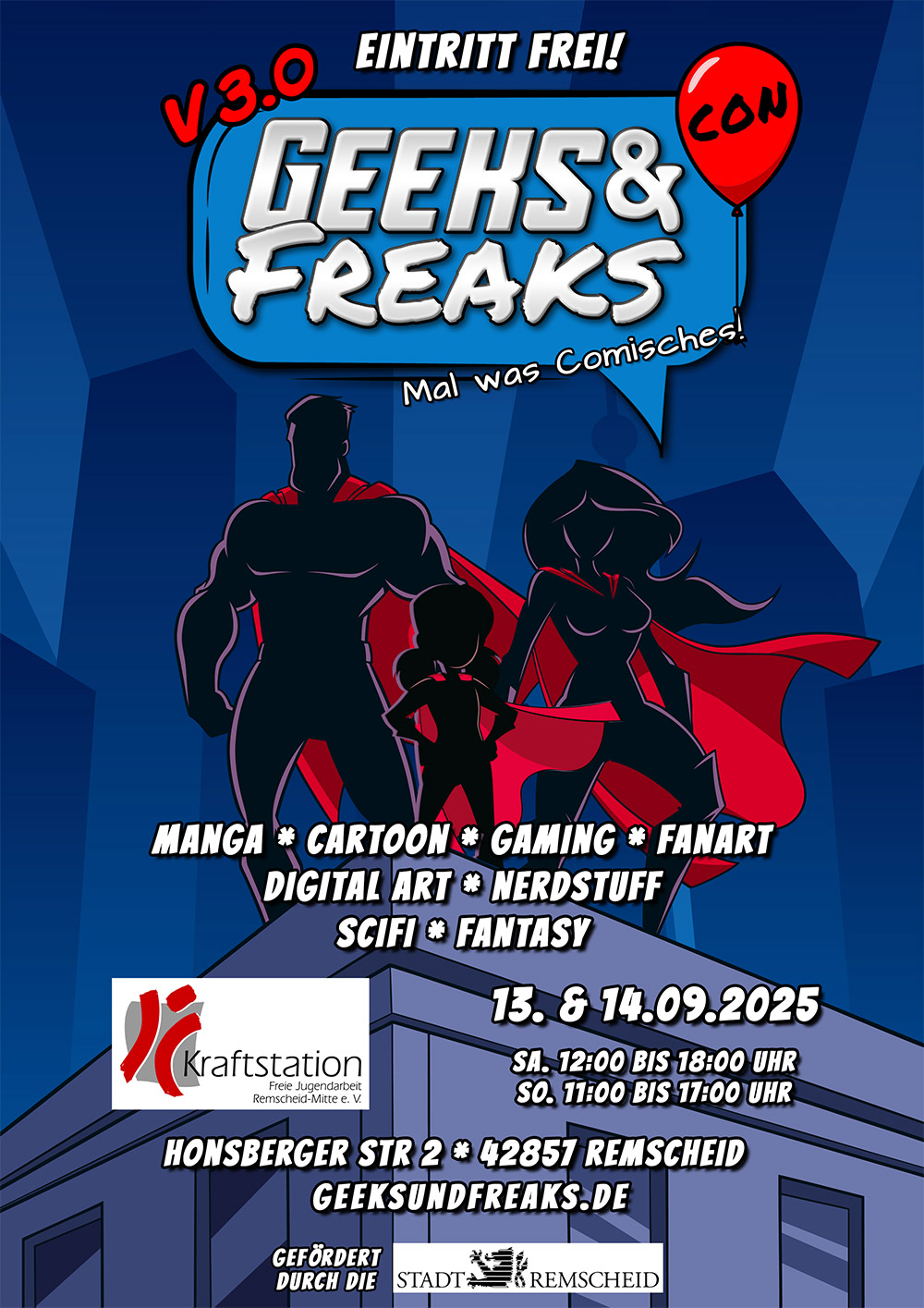 Für die Remscheider Veranstaltung „Geeks & Freaks“, eine Popkultur-Convention mit kostenlosem Eintritt, eine Art Mini-Comic-Con rund um Manga, Cosplay, Gaming, Science Fiction, Fantasy, digital Art und verwandte Themen sollte eine Webseite erstellt werden. Die Wahl für das CMS fiel auf WordPress. Hierbei wurden zusätzlich auch Corporate Design und weitere Designarbeiten (Flyer, Poster, Banner, unten ein Beispiel) durchgeführt.